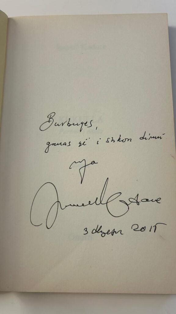 Po kërkoja një libër për t’u rikthyer te zëri i Shqipërisë. Dita ishte e zymtë, me atë lagështinë e butë që i paraprin dimrit. Dora më ndaloi mbi Kukulla — libri i kujtimeve të Ismail Kadaresë për nënën, për vajzat, për gratë e jetës së tij, për Shqipërinë. E hapa dhe zura ta shfletoja. Diku pas faqes së parë u ndesha me të papriturën që ma mbajti frymën pezull: lexova me një frymë autografin që më dedikohej: