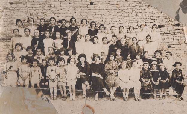 [9]Arkivi i Muzeut Kokalari, Gjirokastër. Në qendër, ulur Urani Rumbo, drejtoresha e shkollës dhe në krah mësuesja Hasibe Hashorva. Musine Kokalari, rrjeshti i dytë, e katërta duke filluar nga e djathta