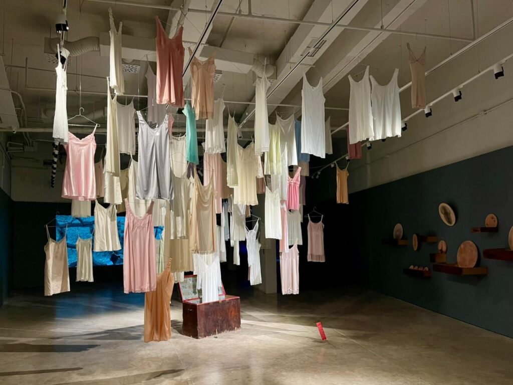 Kështu ndodh në mënyrë harmonike me instalacionin “Metafora e përmbajtjes” ku 100 këmisha nate qëndrojnë të pezullta si për të na sfiduar në heshtjen e tyre të brishtë që të kërkojmë përtej estetikës së kësaj vepre. Të ngecura në hapësirën e galerisë, këto veshje të holla që shoqërojnë trupin femëror në prehjen e gjumit, janë njëkohësisht edhe dëshmitare të ëndrrave, pasioneve, dëshirave, por edhe të dhunës, keqtrajtimit e pafuqishmërisë të të njëjtës krijesë që i mban veshur. Ashtu siç dalin nga një sënduk ku historiku i gruas përçohet ndër breza, po ashtu edhe na dëshmojnë se të pakta janë ngjarjet që kanë ndryshuar rrjedhën e historisë njerëzore.