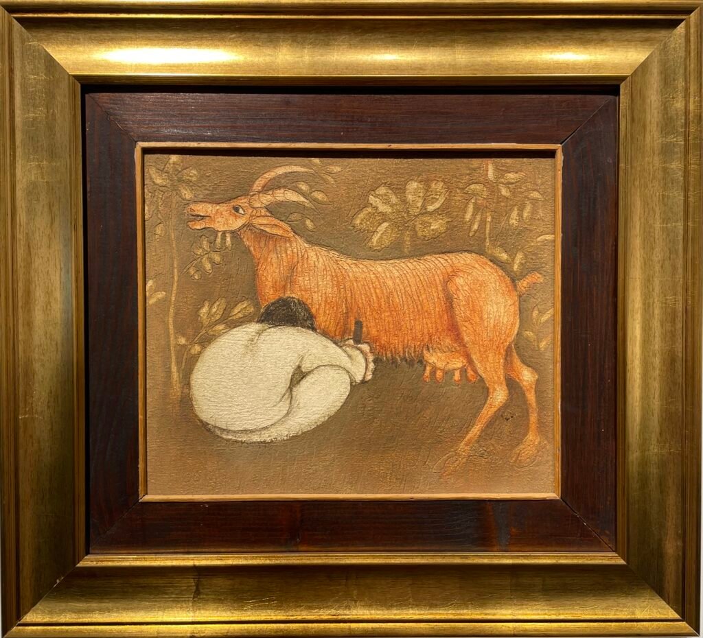 Njëra nga pikturat e ekspozuara paraqet një figurë njerëzore pranë kafshës, në një ambient rural, të thjeshtë. Marrëdhënia mes njeriut dhe kafshës trajtohet si pjesë e një realiteti të zakonshëm jetese. Nuk ka shenja heroizmi, as dramatizim të situatës. Figura njerëzore vepron brenda rregullit të qartë të përditshmërisë, ku puna dhe kujdesi janë pjesë e natyrshme e jetës. Pikërisht kjo qasje e drejtpërdrejtë dhe e përmbajtur i jep veprës një ndjenjë besueshmërie, duke e vendosur skenën në një kontekst të qëndrueshëm dhe të njohur, ku veprimi nuk kërkon justifikim dhe as interpretim të tepruar.