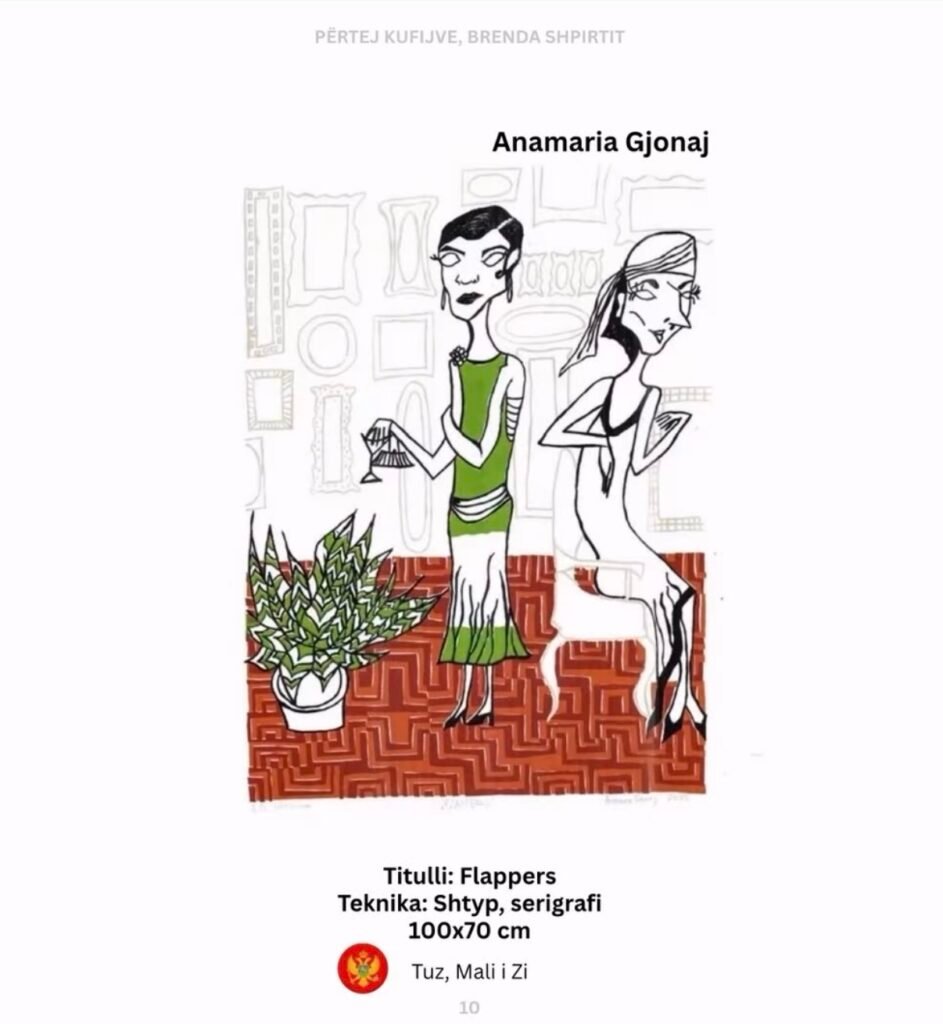 Anamaria Gjonaj dhe Arlinda Dushaj, dy artistet nga Tuzi, ekspozojnë dy koncepte të ndryshme. Në grafiken Flappers të realizuar në teknikën e shtypit, serigrafisë, Anamaria Gjonaj ndërton një hapësirë figurative ku dy figura femërore vendosen brenda një mjedisi dekorativ, ku vijat janë të theksuara, deformimi i figurave është ekspresiv dhe përdorimi i elementeve grafike krijojnë një estetikë që i afrohet ilustrimit dhe karikaturës bashkëkohore me një esencë avangarde.