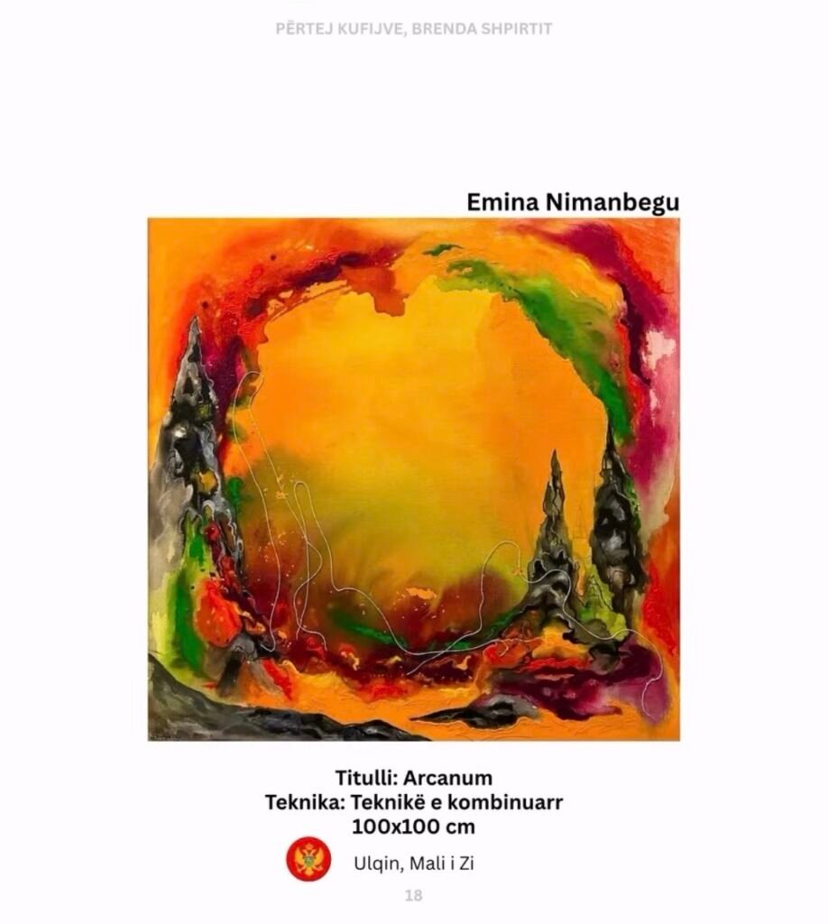Emina Nimanbegu, sjell pikturën Arcanum dhe krijon një hapësirë vizuale të mbushur me energji dhe tension kromatik, ku ngjyra bëhet elementi kryesor i komunikimit mes veprës, artistës dhe publikut. Kompozimi abstrakt organizohet rreth një qendre të ndritshme që tërheq vëmendjen e shikuesit. Qendra hapsinore simbolitikisht vlen si një portë që të çon drejtë një dimensioni tjetër. Një dimension imagjinar, sureal dhe larg prekjes njerëzore. Në këtë mënyrë formohet një ndjenjë gravitacioni vizual. Një gravitacion që falë ngjyrave të ndezura jep një ndjenjë ekuilibrimi mes kaosit dhe harmonisë. Në këtë vepër forma dhe ngjyra bashkëveprojnë dhe mbartin procesin e lindjes së emocionit dhe intelektit personal.