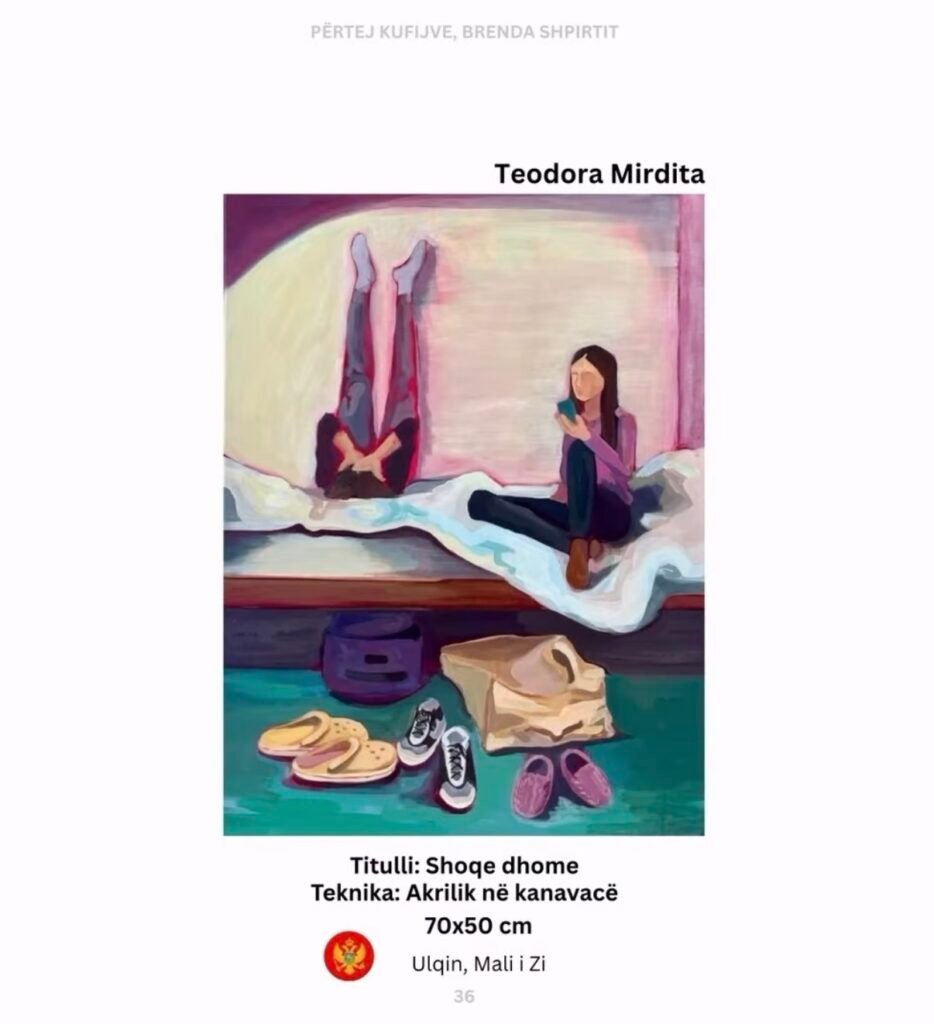 Artistja e re e skenës artistike të Malit të Zi, Teodora Mirdita, sjell pikturën Shoqe dhome. Ajo nëpërmjet akrilikut në kanavac shëndrron hapsirën intime të përditshme të dhomës, në një vend reflektimi mbi përvojën personale dhe mbi marrëdhëniet njerëzore. Ajo nxjerr intimitetin në publik, por jo vetëm atë të dhomës. Ambienti që rrethon figurat femërore krijon narrativën e jetës së zakonshme, ndërsa figura femërore janë ato që vezhguesin e tërheqin në intimën e tyre. Në intimën e mendimeve, problemeve, ndjenjave dhe kompleksioneve rinore të tyre. Përmes paletës kromatike dhe formave të thjeshtuara, momenti i zakonshëm i përditshmërisë shndërrohet në një reflektim mbi hapësirën personale dhe mbi dimensionin emocional të jetës moderne.