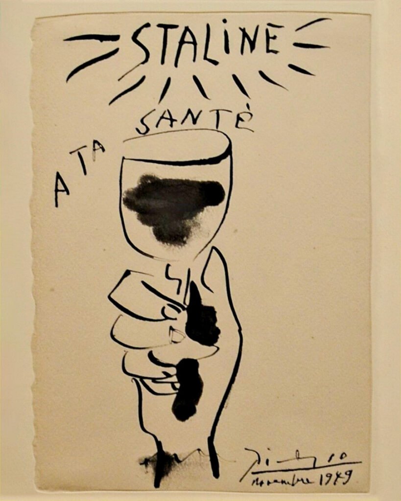 Kur në vitin 1953 vdiq Josif Stalini, Pikaso e vizatoi portretin e tij – për zemërimin e komunistëve, ai e paraqiti sekretarin e përgjithshëm të ri në moshë. Madje shpërtheu edhe një skandal: shokët francezë u indinjuan nga ky imazh jokanonik. Ndërsa Lui Aragon, poet dhe kryeredaktor i Les Lettres Françaises, ku u botua portreti, e qortoi mikun e vet: “Stalini nuk mund të shpiket.”