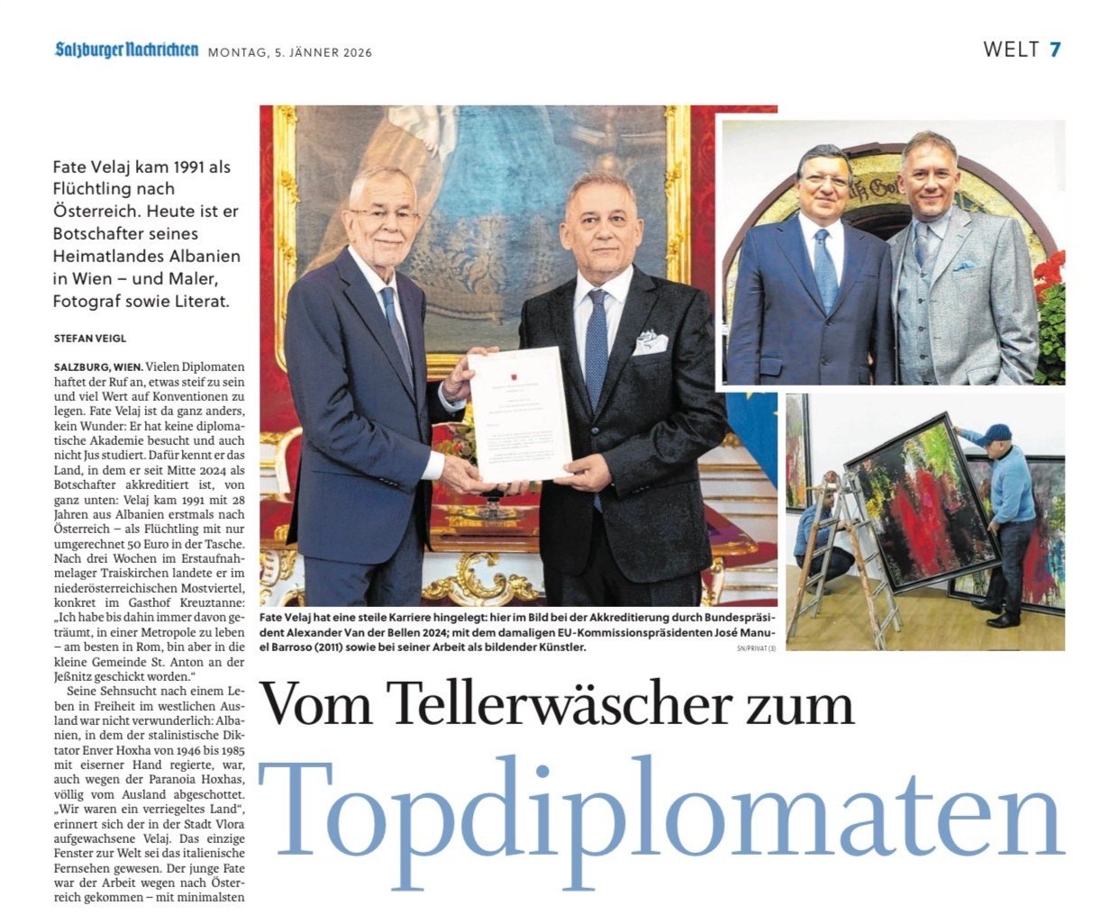Mediat austriake vazhdojnë t’i kushtojnë vëmendje Fate Velajt, ambasadorit të Shqipërisë në Vjenë. Gazeta prestigjioze austriake Salzburger Nachrichten i ka kushtuar atij një faqe të tërë, duke ndërtuar një “story” të jetës së tij, që nis nga puna si pjatalarës në shtator të vitit 1991 dhe vazhdon me një rrugëtim të mbushur me djersë dhe lot, me lindje dhe humbje, mes dëshirave dhe ëndrrave. www.velaj.com