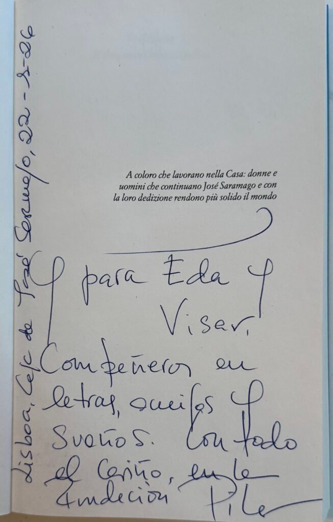 Ne flisnim më shumë italisht, Pilar spanjisht, kur nuk kuptoheshim në ndonjë detaj, Antonio që bënte dhe video, përkthente në anglisht për ne, por kishte diçka që qendronte mbi gjuhët, që s’ishte veç buzëqeshje e gjeste miqësore mirëkuptimi, por vetë kuptimi, edhe dhimbje. Eda i kërkoi një autograf Pilarit mbi librin me poezi të Saramagos, por do ju jap dhe librin tim, tha ajo, botuar nga Feltrineli, “L’intuizione dell’isola. Ditët e Jozé Saramagos në Lanzarote” (Intuita e Ishullit. Ditët e Jozé Saramagos në Lanzarote).