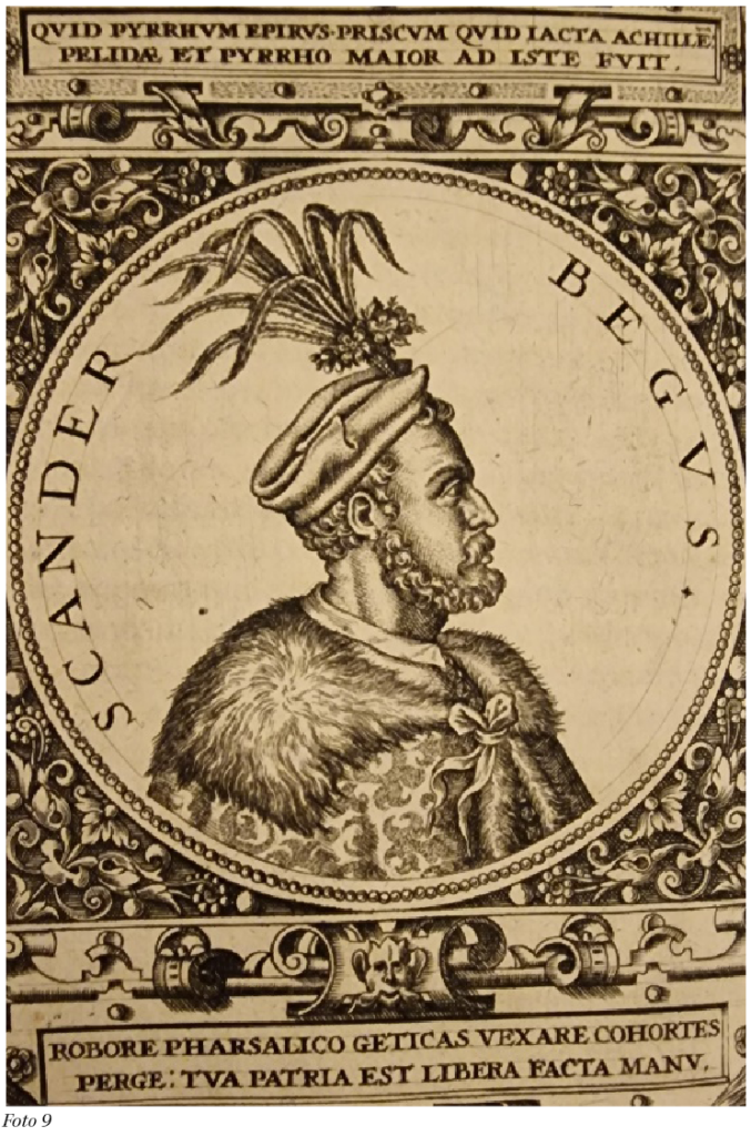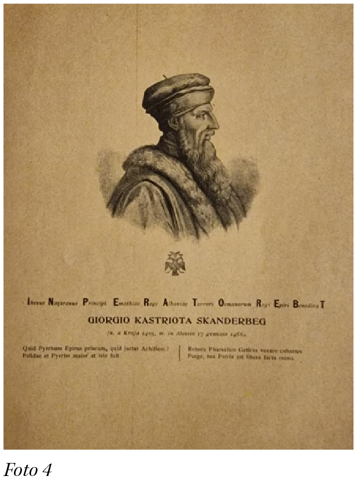 –Portreti i Skënderbeut: i paraqitur në formë medaljoni, vjen me referenca të qarta në modelet e neo-humanizmit europian dhe kornizës ikonografike të shekujve XVI–XVIII, në vazhdën e përfytyrimit të heroit sipas portretizimit të famshëm që gjendet në Galleria degli Uffizi në Firence (mesi i shek.XVI), thuajse identik me portretin e Skënderbeut në librin Ritratti ed Elogii di Capitani Illustri (1635) apo me një tjetër portret – medaljon të botuar në librin La Spada d’Orione (1680), të dy botime që e trajtojnë figurën e Skënderbeut mes mbretërve, fisnikëve e udhëheqësve ushtarakë më të shquar në rang evropian (foto 6, 7, 8). Në të gjitha këto portretizime Skënderbeu shfaqet jo si një luftëtar, por si një princ neo-humanist, i qytetëruar në qendrim dhe veshje, pjesë e natyrshme e botës politike europiane. Kjo i shërbente tezës së Skiroit se “çështja shqiptare është çështje e Evropës”.