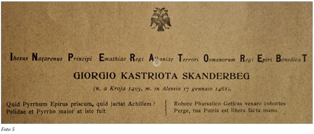 “Ihesus Nazarenus •Principi Emathiae • Regi Albaniae •Terrori Osmanorum •Regi Epiri •Benedicat T.”[[1]] (foto 1,2,3)