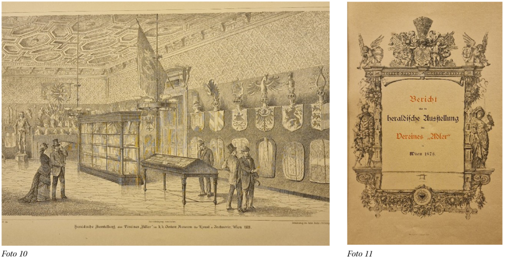 Zbulimi na u shfaq papritur, por në një formë aq bindëse, aq të dokumentuar e të pacënueshme në vërtetësinë e tij, sa na e bën mjaft të lehtë përcjelljen e tij tek çdo bashkatdhetar që na lexon. Para pak muajsh, në mesin e kërkimeve tona për pasurimin dhe plotësimin e koleksionit të botimeve me interes albanologjik dhe në veçanti të atyre që lidhen me figurën e Skënderbeut, ramë në gjurmët e një botimi përmbledhës, dokumentues dhe përshkrues, i cili në kohët e sotme do të thirrej katalog, rreth një ekspozite heraldike të hapur në Vienë, në prill të vitit 1878. Katalogu me titull “Bericht über die heraldische Austellung des Vereines “Adler” (Raport përmbledhës për Ekspozitën heraldike të Shoqatës “Adler”) ka 218 faqe tekst, 39 faqe hyrje dhe 69 faqe të plota me ilustrime, në formatin 32.5 cm x 24.5 cm. (Foto 10,11).