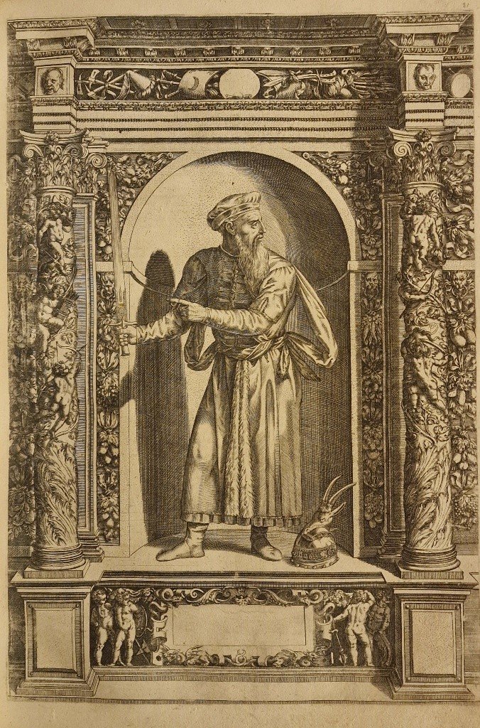 Edhe në këtë element të fundit Skiroi nuk shpik apo krijon asgjë të re, por vetëm mëton të “kanonizojë” një tentativë të mëparshme të integrimit të këtij epigrami-epitaf katërvargsh në ikonografinë skënderbejane, të marrë nga vetë autori i epigramit, poeti neolatin francez, njëkohësisht portretist dhe botues, Jean Jacques Boissard, i cili në dy botime të tij Icones diversorum hominum fama et rebus gestis illustrium (1591) dhe Vitae et Icones Sultanorum Turcicorum, etc. (1597) boton portretin e Skënderbeut të shoqëruar nga katërvargshi latin i krijuar prej tij, që Skiroi e risjell treqind e ca vite më pas identik, si tekst dhe në ndarjen e tij në dy blloqe nga dy vargje (foto 9).