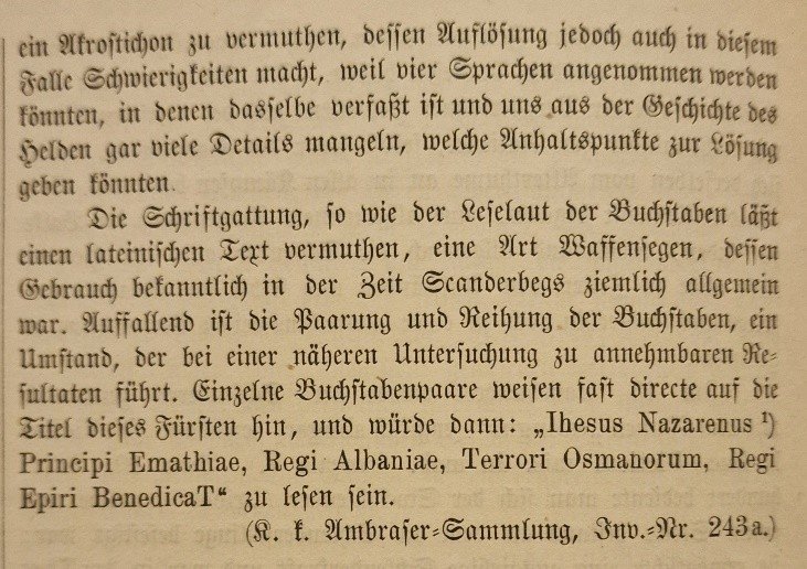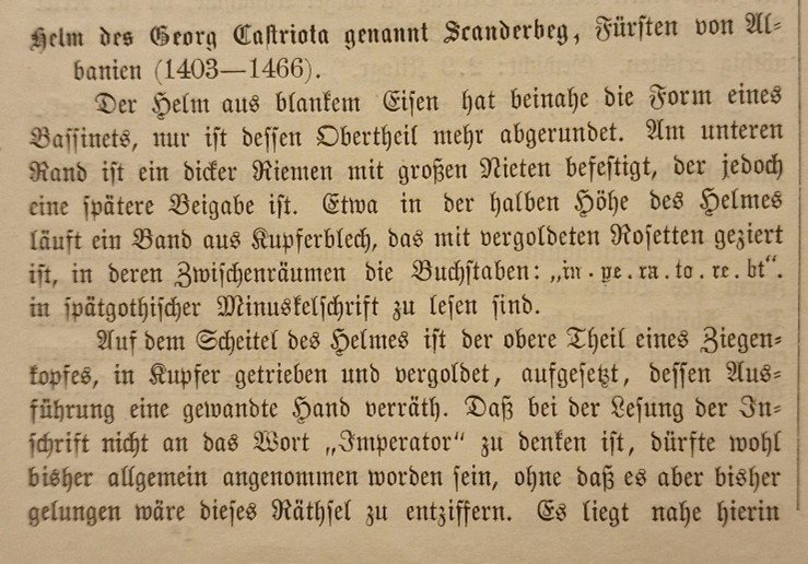[9] Wendelin Boeheim, “Helm des Georg Castriota genannt Scanderbeg, Fürsten von Albanien (1403–1466)”, në Übersicht der heraldisch-genealogisch-sphragistischen Ausstellung des Vereines “Adler” in Wien, Wien, 1878, f.4.